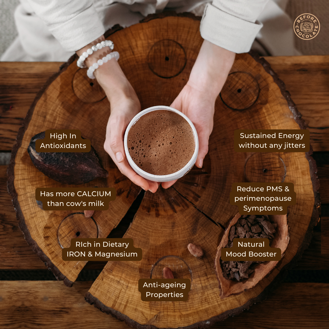 You'll find no hidden ingredients, no e numbers or any filler pretending to taste like chocolate. This is what real chocolate tastes like made from whole ground cacao beans. Make our Hot Chocolate your new evening ritual. Enjoy.